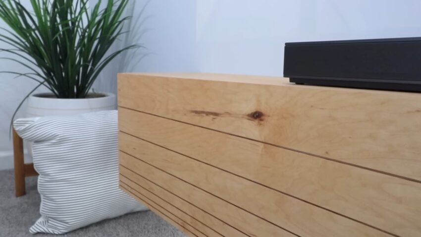 Then, mount the TV stand onto the plywood. This provides a secure base and allows you to position the TV stand as desired.